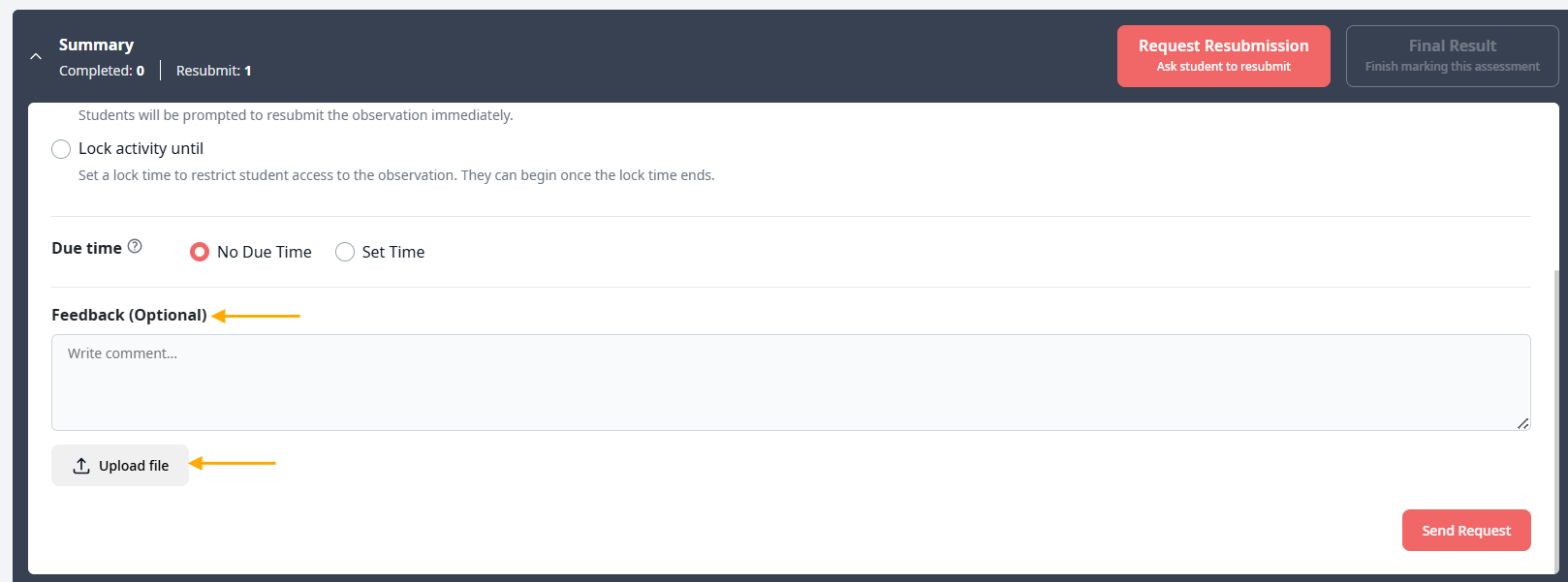 - File attachment: Upload a file to accompany your feedback — for example, an annotated rubric, a reference document, or additional instructions.