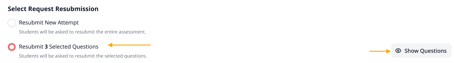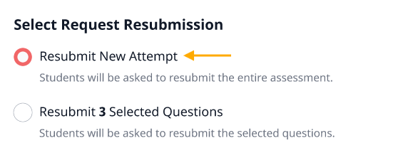 Note: If the assessment has attempt limits and the student is already on their last attempt, requesting resubmission for selected questions will grant the student one additional attempt beyond the limit.