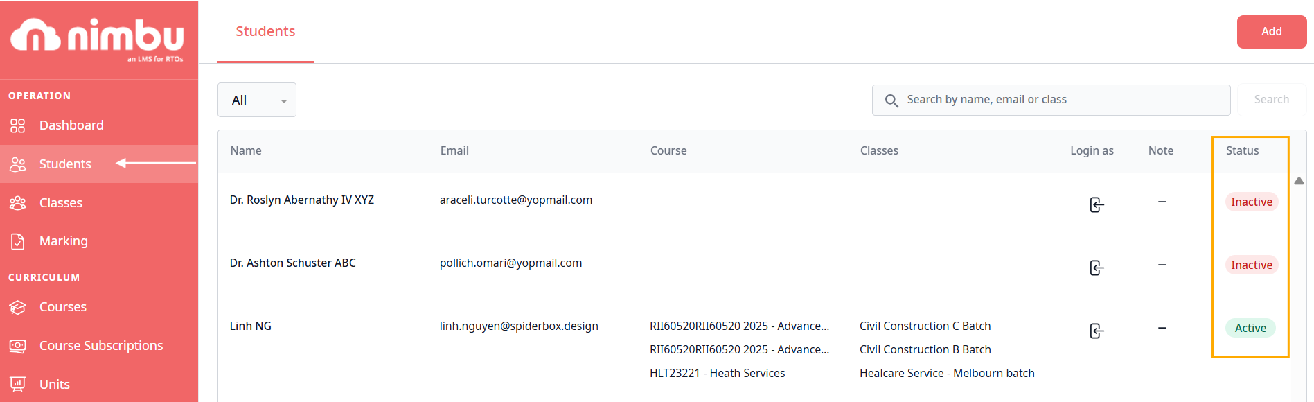 A student's account status in Nimbu controls whether they can access the platform at all. Active students can log in and engage with their training; inactive students cannot. Managing this status allows administrators to suspend access when needed, for example, when a student withdraws, takes an extended leave, or when an account was created in error - while preserving their enrolment records and compliance history for reporting purposes.