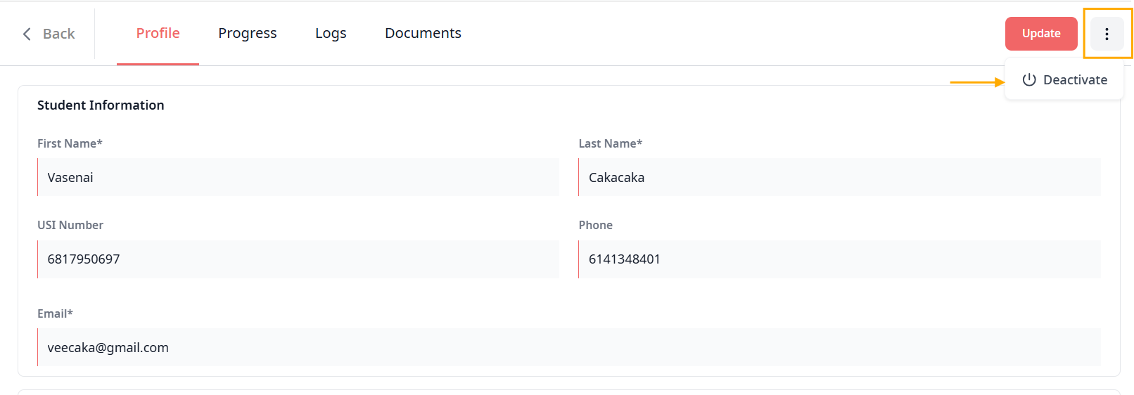 - Open the profile by clicking the student's name. The profile opens on the Profile tab, showing the student's Student Information fields: First Name, Last Name, USI Number, Phone, and Email.