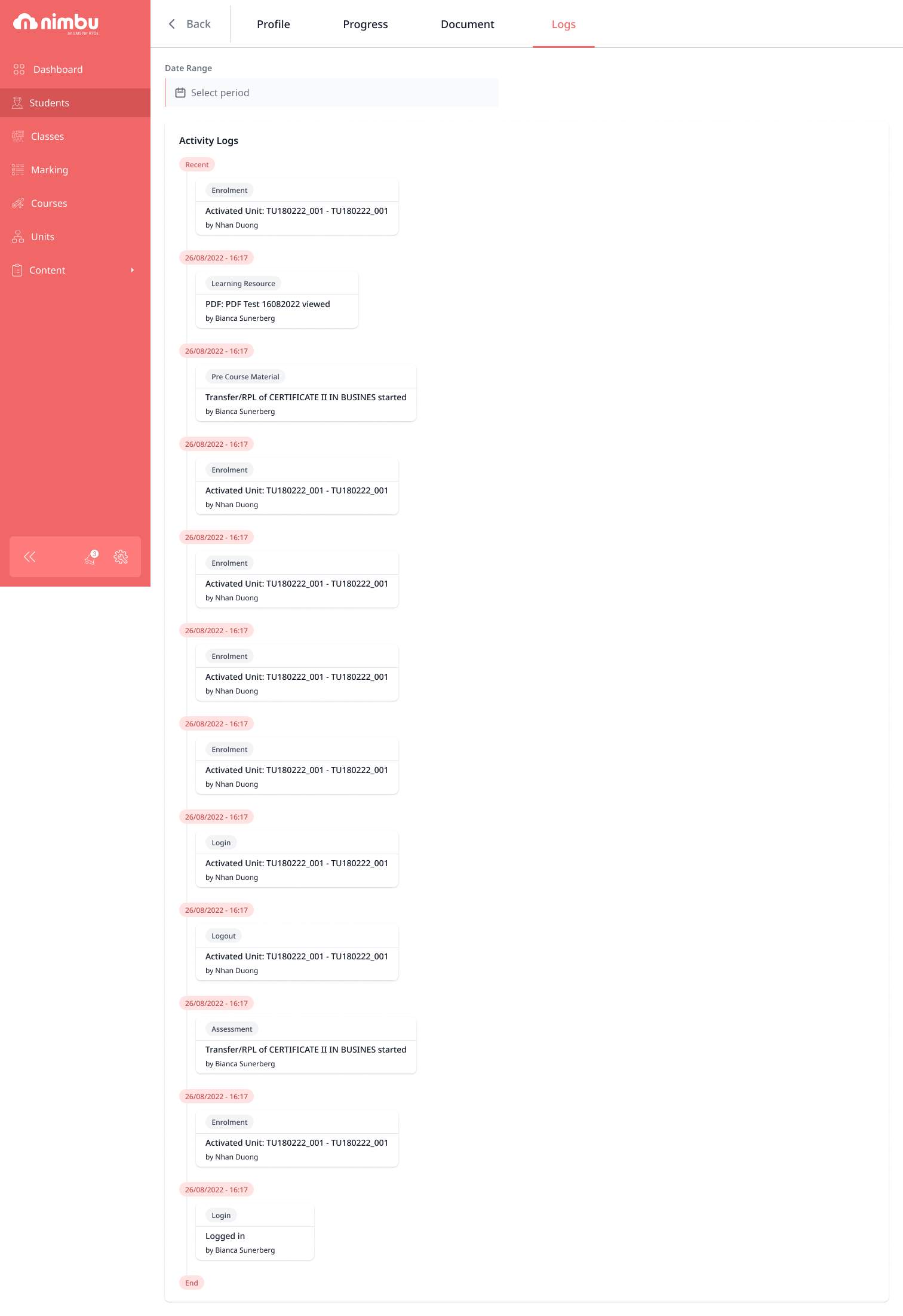 Nimbu maintains a complete, chronological record of every significant action taken on a student's enrolment. This activity log gives trainers and administrators a reliable audit trail, showing exactly what happened, when it happened, and in what sequence without the risk of entries being altered or deleted.