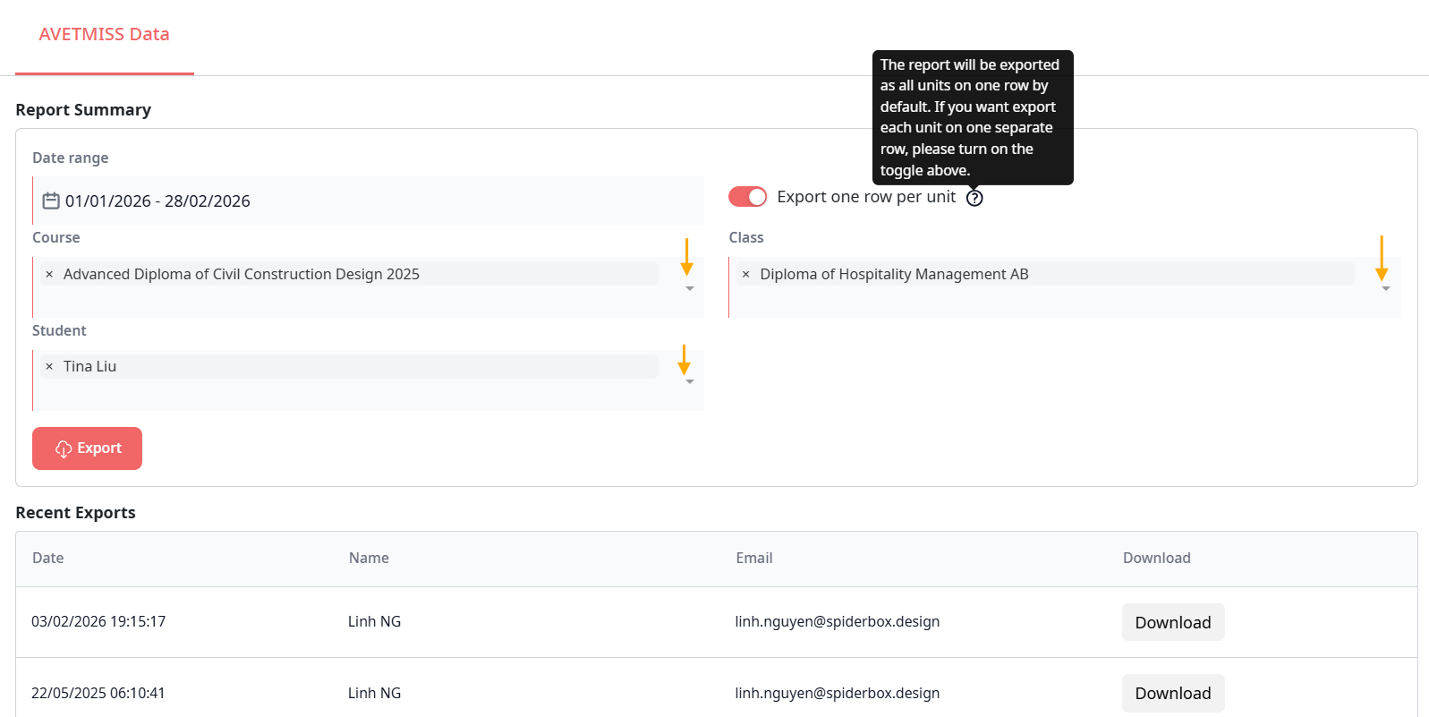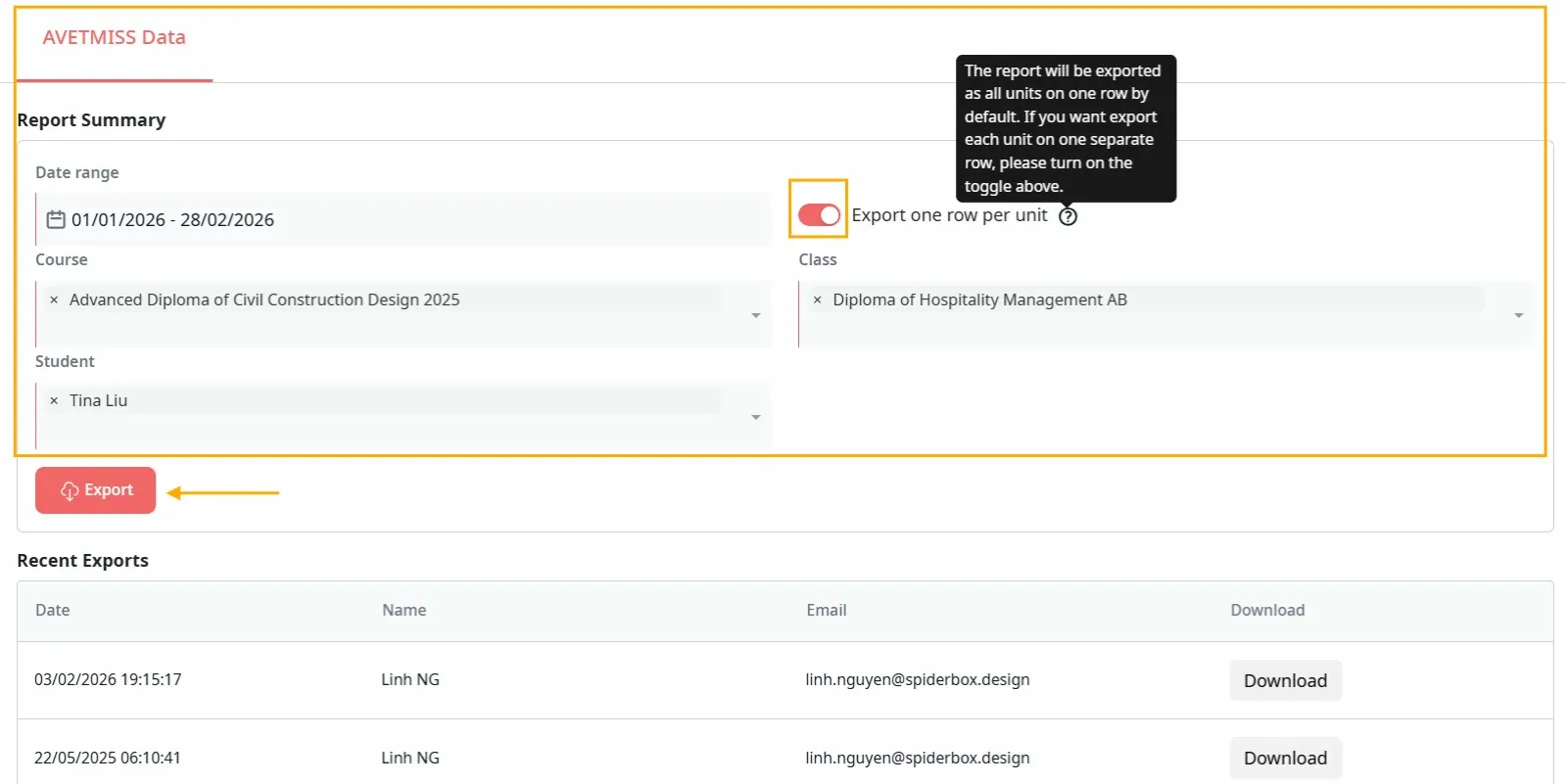 The default format (toggle off) provides a compact view of enrolment data. Turn the toggle on when you need unit-level outcome data in a row-per-unit format this is typically required for formal AVETMISS submissions to your STA or NCVER, as unit outcomes must be reported individually.