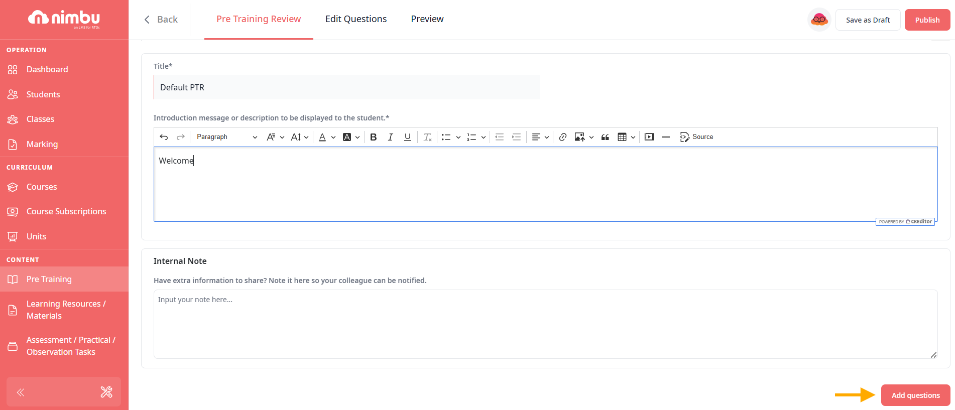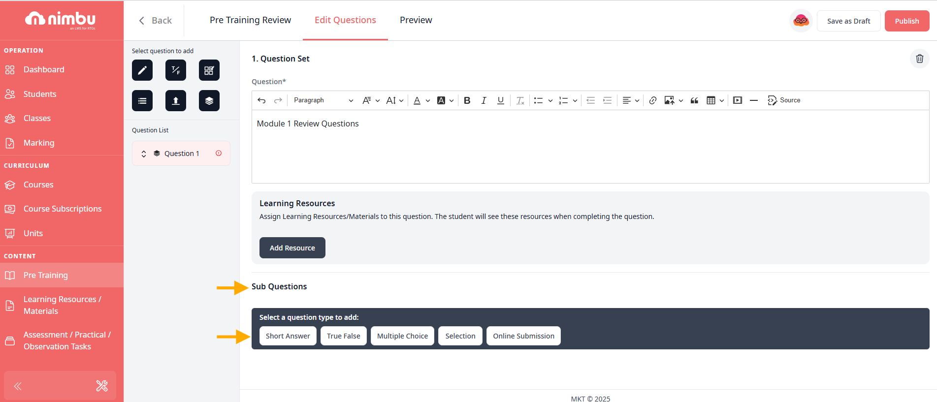 Step 1 - Navigate to the Content activity - Pre Training Review to add the question.