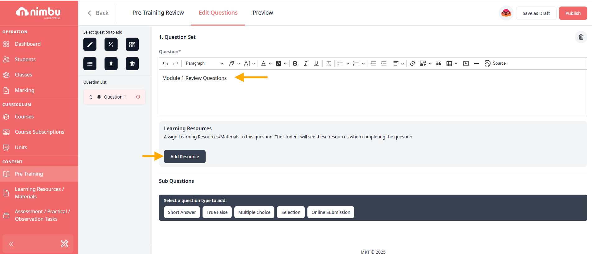 If you want to provide students with additional material to help them answer the question, you can use the Learning Resources section. Click Add Resource to link relevant documents, videos, or other materials from your course.