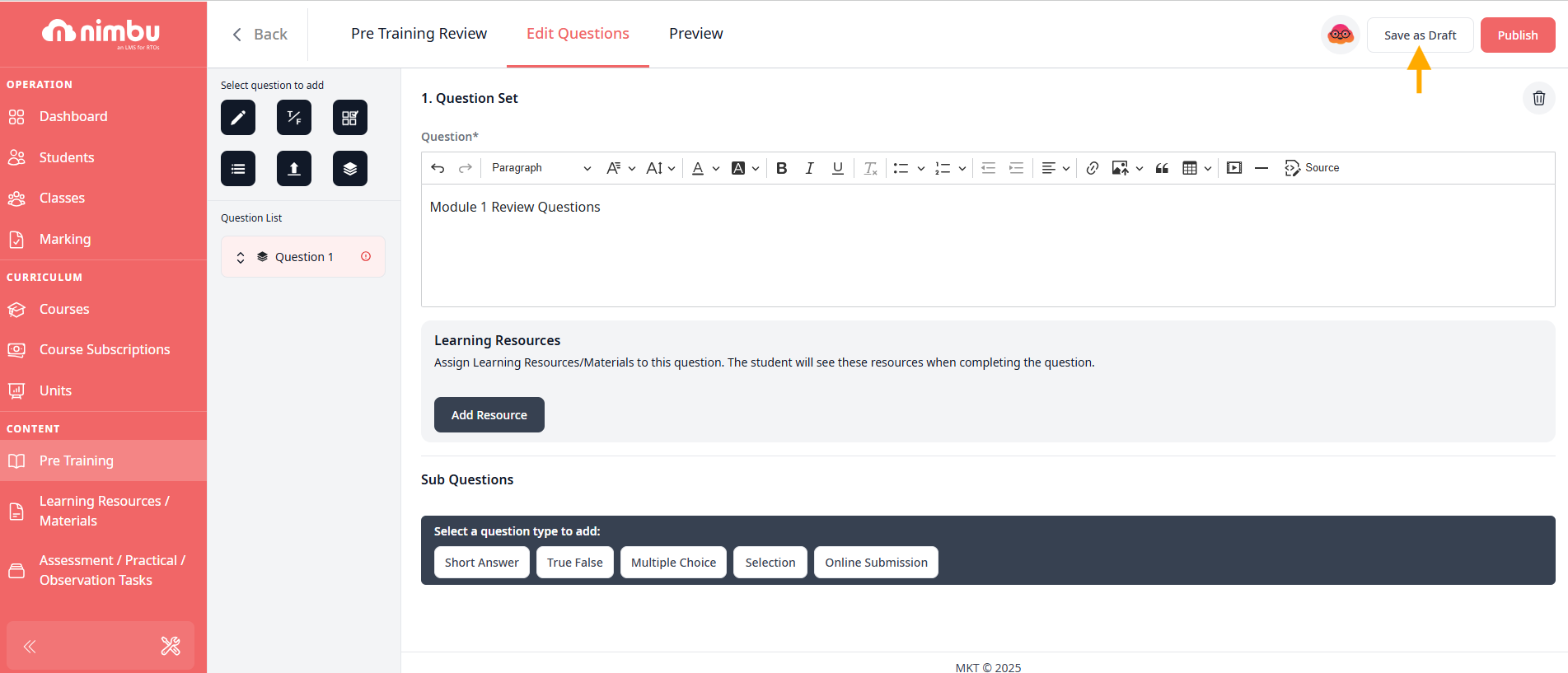 After finishing the configuring your question, click the Save as Draft button in the top-right corner to save your progress or you want to finish it later.