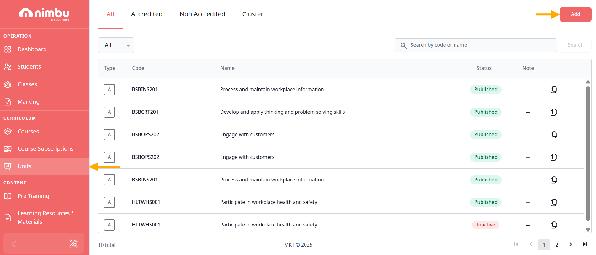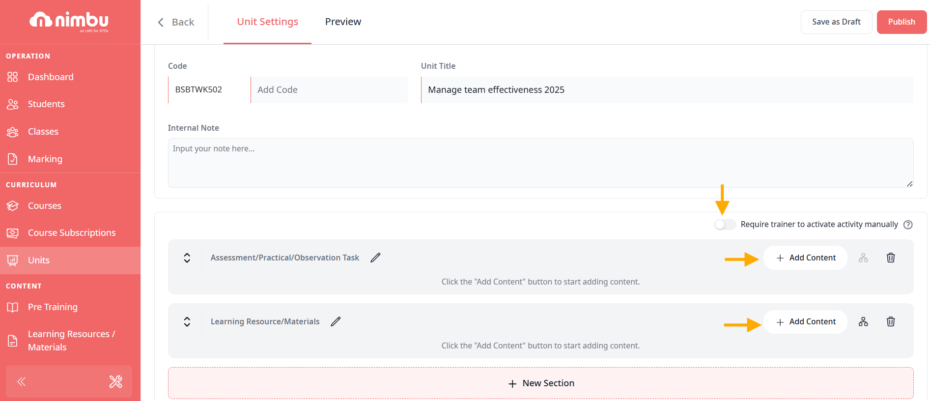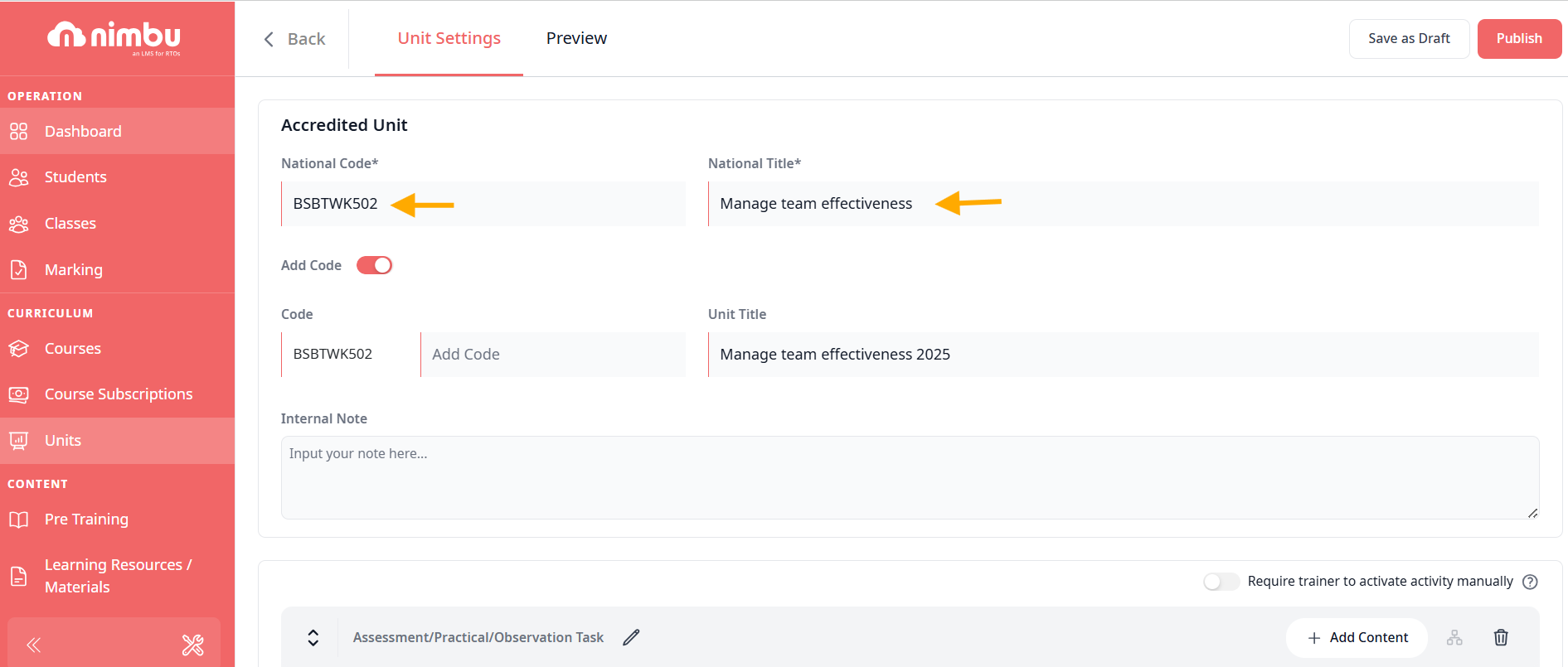 Creating a new unit in Nimbu allows you to organise learning content and assessments into smaller, manageable components. You can create both accredited and non-accredited units.