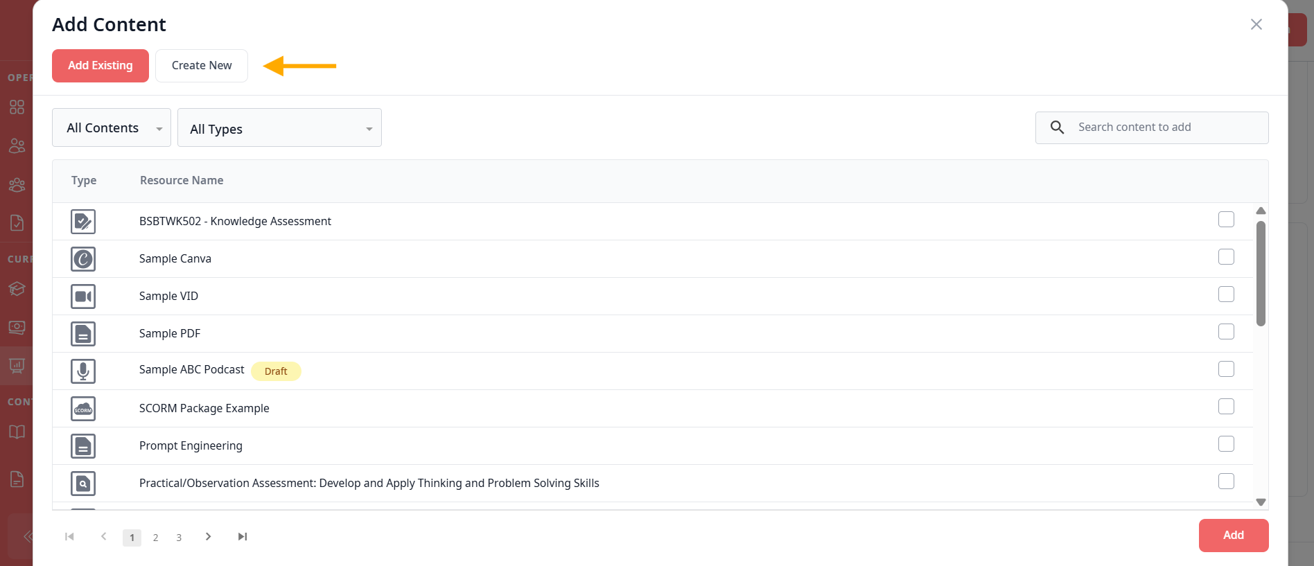 Next, Click to the "Add Content" to select the existing content or create new one. You can switch the togle to turn on/ off option require trainer to activate manually