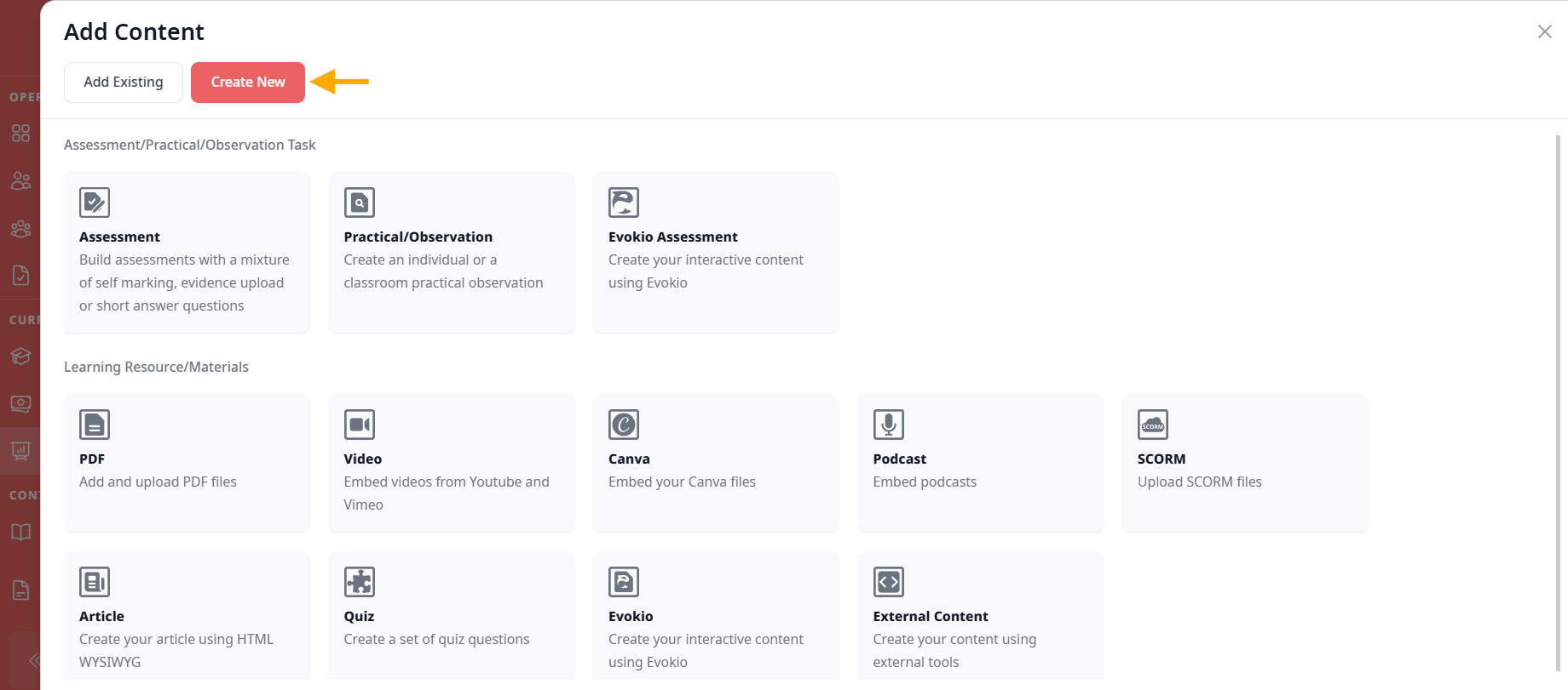 - If you choose "Create New": It will take you to a new screen where you can continue working with a list of options, including: Assessment/ Practical/ Observation Task and Learning Resourse/ Materials
