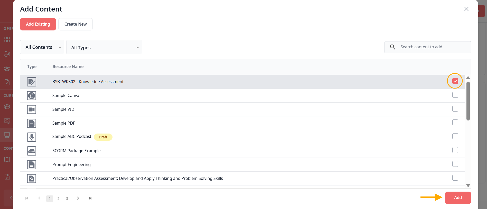 - If you choose "Add Existing": All the created Contents are ready, simply tick to the box your choice and Press "Add" to finish your selection